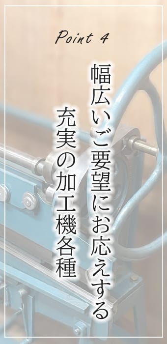 私たちは、いろいろなご要望に応えられるよう、多彩な加工機を揃えています。
